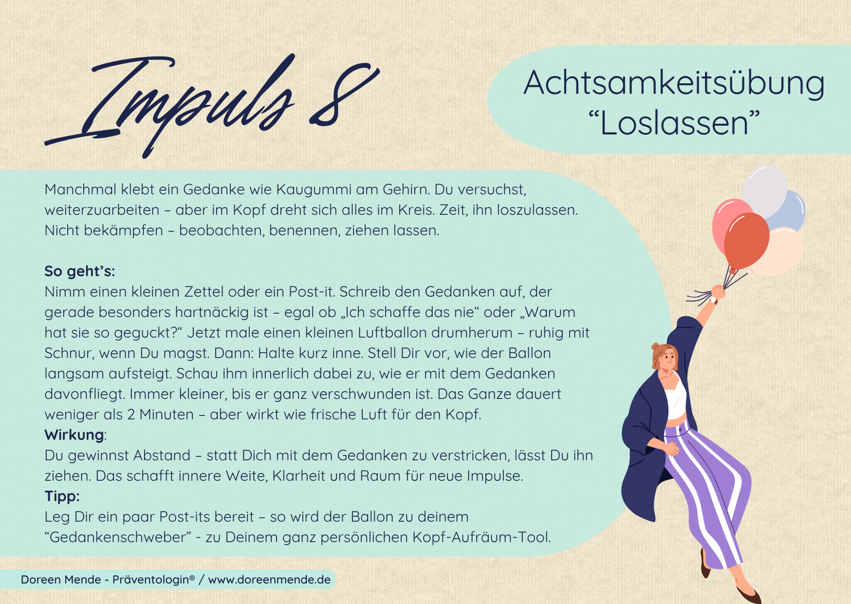 - 12 Achtsamkeitsimpulse – von „Fenstermoment“ über „Einfach mal STOPP“ bis „Arbeit aus – Ich an“